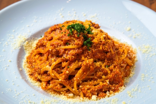 日本人好みのモチモチ感と滑らかさに、パスタの本場・イタリアの人々が求めるコシと粘りを同居させた奇跡の生麺「淡路麺業」の「モッチリーニ」を採用した特製パスタ。牛ひき肉と香味野菜を炒め合わせたオリジナルのトマトソースが絡みつく贅沢な味わいには、お腹も大満足の一皿です。