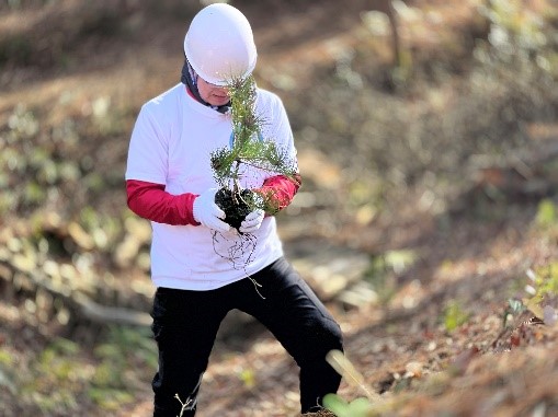 今年度は、静岡県での植樹活動では過去最大の42名の参加者数となり、うち初参加が8名となりました。参加者は植樹方法を教わり、急勾配な斜面に横浜ゴムで育成されたアカマツの苗木を110本植樹しました。