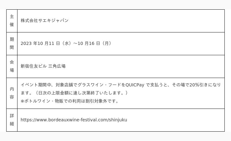 株式会社ジェーシービー (本社:東京都港区、代表取締役兼執行役員社長:二重 孝好、以下:JCB)は、2023 年10 月11 日(水)から16 日(月)まで開催する「ボルドーワイン祭りin 新宿」に協賛し、グラスワインやフードをQUICPay で支払うと20%引きとなる優待を提供します。