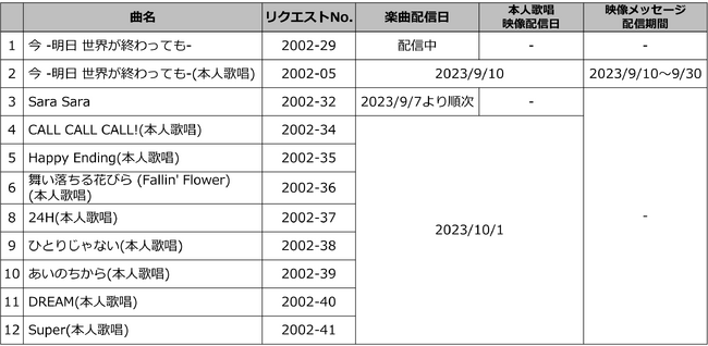 1.通信カラオケDAMにJAPAN BEST ALBUM「ALWAYS YOURS」より、新曲「今 -明日 世界が終わっても-」 「Sara Sara」を配信。*1【2023年9月7日(木)より順次】