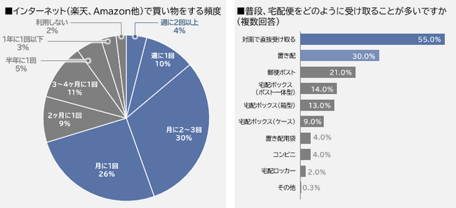 インターネットで買い物をする頻度を調査したところ、月1回以上ネットで買い物をする方は7割という結果になりました。また、受け取り方法については、55%の方が対面で直接受け取ると回答しました。