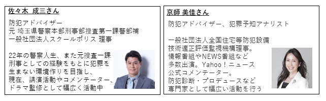パナソニック株式会社は、11月28日(火)メディア関係者を対象に「すまいの防犯ラウンドトークセッション」を開催しました。近年、訪問詐欺や給付金詐欺の手口が多様化し、高齢者を中心とした詐欺の被害があとを絶ちません。そこで防犯アドバイザーの佐々木 成三さん、京師 美佳さんをゲストにお迎えし最近の犯罪事情や、今からできる対策方法、年末年始に家族で話し合ってほしい事についてお話いただきました。また専門家のお二人がおすすめする、パナソニックの防犯商品をご紹介しました。