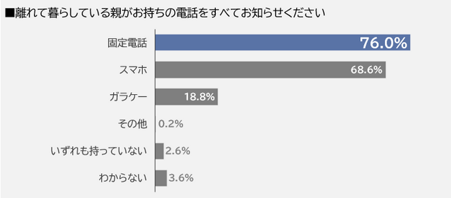 65歳~89歳の離れて暮らす親が持っている電話について調べたところ、スマホの保有も多くなっているものの、固定電話があるお宅が76%という結果となりました。親戚や古くからの友人とのコミュニケーションツールとして、多くの方が固定電話を使用している事がわかります。