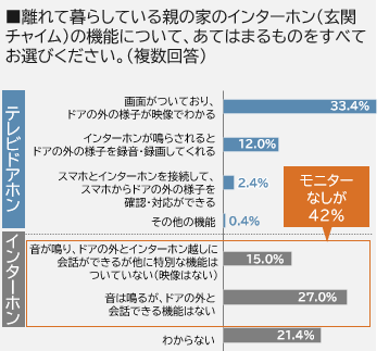 離れて暮らしている親の家のインターホン(玄関チャイム)の機能について調査したところ、モニター画面つきでドアの外の様子を確認できるテレビドアホンを保有している家も増えてきていますが、モニターがついていない家が42%という結果になりました。宅配業者や、ガス点検を装った強盗の場合もありますので、予定がない訪問者が来た場合は、対面せずに訪問者を確認する事が重要です。