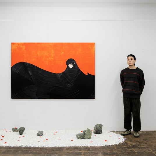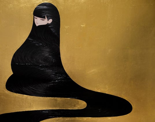 黒髪が印象的な作品シリーズ「麗髪(うるかみ)」は、昭和時代に活躍したモデル・山口小夜子にインスピレーションを受けており、人に宿る美しさや憂いを追求しています。制作においては日本古来の色彩や伝統工芸品の制作手法を引用しつつ、現代のマスキングワークやイラストレーションの技法も組み合わせています。黒髪は、刷毛目付けの技法により、ランダムに散らばる絵の具が偶然同じ軌道を辿り、やがてどこかで収束しており、その線は、人生のような運命的なものを連想させます。流れと共に変化し老いていく、移りゆくものを美しいと感じる価値観と、古いものを学びアップデートさせていく姿勢を現代に提示しています。本展では、やまなかが京都・二条城の本丸御殿の中で金箔の襖絵を見たことが制作のきっかけとなった、金箔を用いた「麗髪」など、栄華の中にも儚さを感じさせる新作をはじめ、鉛筆でのドローイングなどを展示します。