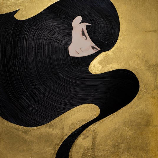 《麗髪 撥(うるかみ はつ)》,530×530mm,木製パネルにアクリル,金箔