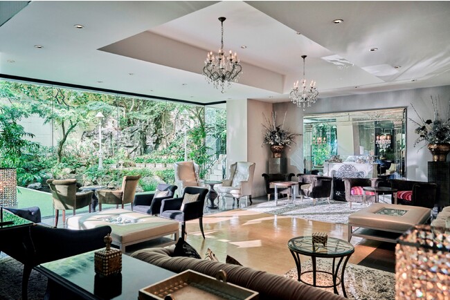 大階段を下りた先に広がるのは、明るく開放的なパーティフロア。リビング、バンケット、ガーデンがパノラマで臨める圧巻の広さです。