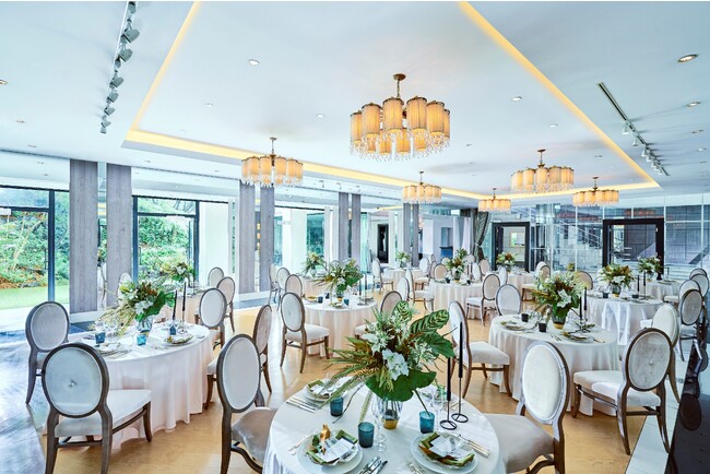 食事会場となるのは、新宿・曙橋の閑静な街に佇む「アプローズスクエア 東京迎賓館」。披露宴会場「グランメゾン」の大きな窓から緑豊かなガーデンを眺めながら、ゆったりとお食事をお召し上がりいただけます。また、水のせせらぎが心地よい音を響かせるガーデンや、豪華な調度品に彩られたエントランスなど、写真映えスポットも満載なので、愛犬とともに記念撮影を行っていただけます。