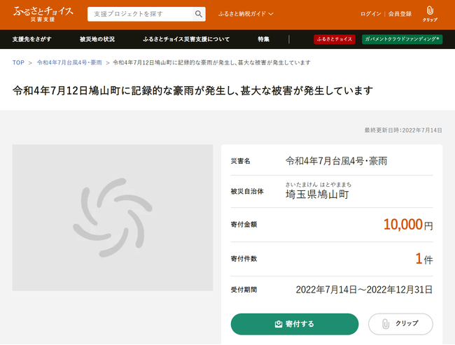 国内最大級のふるさと納税総合サイト「ふるさとチョイス」を企画・運営する株式会社トラストバンク(本社:東京都渋谷区、代表取締役:川村憲一、以下「トラストバンク」)は7月14日、ふるさと納税で被災自治体の災害支援に寄付できる仕組み「ふるさとチョイス災害支援」( https://www.furusato-tax.jp/saigai/ )で、埼玉県滑川町に続き、記録的な大雨により被災した埼玉県鳩山町の「災害時緊急寄付申込みフォーム」を開設しました。寄付金は全額、被災地の復旧・復興に使われます。