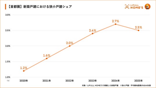 事業を通して社会課題解決に取り組む株式会社LIFULL(本社:東京都千代田区、代表取締役社長:伊東祐司、東証プライム:2120)が運営する不動産・住宅情報サービス「LIFULL HOME'S(ライフルホームズ)」は、首都圏で掲載された新築一戸建てにおける、専有敷地面積が60平方メートル 未満のいわゆる「狭小戸建」について調査しました。