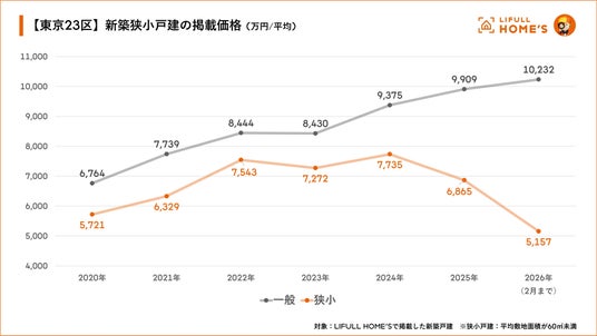 東京23区で敷地面積が100平方メートル 前後の一般的な戸建住宅は年々価格が上昇する傾向にあり、2026年の初動では平均で1億円を突破する状況ですが、同じ新築でも狭小戸建は約半額の5,157万円となっていて、住宅価格が高騰を続ける現在にあって価格優位性が極めて高いと言えます。