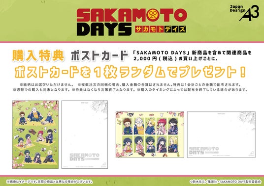 今回発売したTVアニメ『SAKAMOTO DAYS』の新作グッズを含む関連商品を2,000円(税込)お買い上げごとに、ポストカードを1枚プレゼントします。