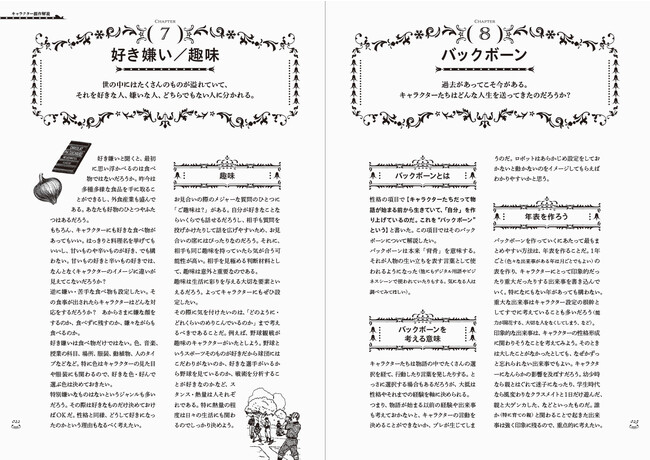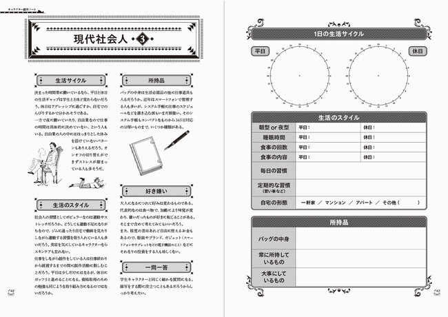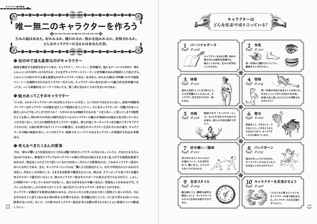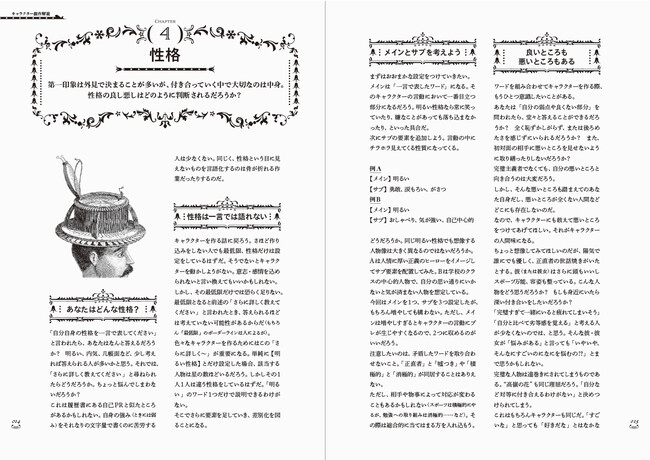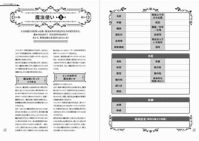 キャラクターは、作品の「顔」といえる存在ですが、キャラクターを生み出すのに考えるべき要素はとても多く、迷う人が多いもの。本書は、このキャラクターをどのように造形していくのかを解説するとともに、学生・社会人・魔法使いなどの人物別に、読者が実際に設定を書き込めるノートを掲載。物語の世界を牽引する、魅力的なキャラクター作りを助けます。