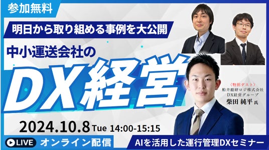 日本最大級のロジスティクス・物流コンサルティングファーム 船井総研ロジ株式会社(大阪本社:大阪市中央区、代表:橋本直行、以下「船井総研ロジ」)の経営コンサルタント講演情報です。2024年10月8日(火)に開催されるオンラインセミナー「コンプライアンスを守り利益を確保するAIを活用した運行管理DXセミナー」にて、船井総研ロジ 経営コンサルタント 柴田 純平が講演します。