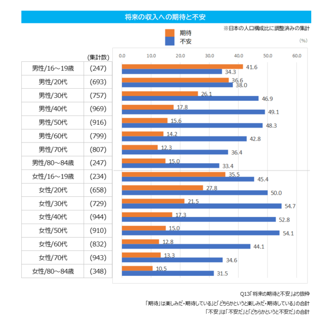 将来の収入に対する期待と不安を尋ねたところ、「期待」(「楽しみだ・期待している」と「どちらかというと楽しみだ・期待している」の合計)が「不安」(「不安だ」と「どちらかというと不安だ」の合計)を上回ったのは男性16~19歳のみで、他は不安に思う方が多いことが分かりました。性年代別で見ていくと、男女ともに「期待」は16~19歳・20代の若年層で高め、「不安」は30~50代で高めであることがわかります。また、女性は16~19歳・20代の若年層で男性の同年代よりも不安を感じる方の割合が特に高い結果となりました。