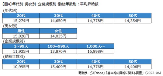 年代別:昇給額は20代が15,274円と最も高く、30代が14,650円、40代が14,778円、50代が14,354円となり、30代以降は大きな差は見られない結果に