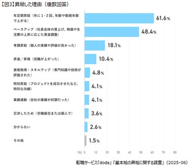 基本給が上がったと回答した人に対し、その理由を複数回答で聞いたところ、最も多かったのは「年定期昇給(年に1・2回、年齢や勤続年数で上がる)」で61.6%となりました。次いで、「ベースアップ(社員全体の賃上げ、物価や生活費の上昇に応じた賃金調整)」が48.4%と半数近くになっており、この2つの割合が突出して高くなっています。一方で、「考課昇給(個人の実績や評価が良かった)」(18.1%)、「昇進/昇格(役職が上がった)」(10.4%)、「資格取得・スキルアップ(専門知識や技術が評価された)」(4.8%)、「特別昇給(プロジェクトを成功させたなど、特別な功績)」(4.1%)、「交渉したため(労働組合または個人で)」(3.6%)など、個人の努力や成果に起因する理由も一定数見られました。【図3】
