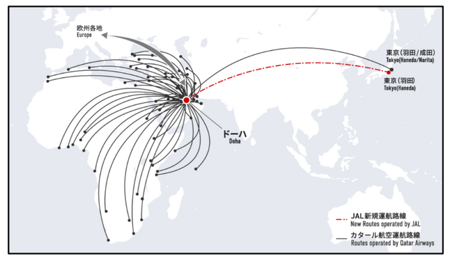 なお、既に実施しているカタール航空運航の東京=ドーハ線のJALコードシェアも引き続き実施します。