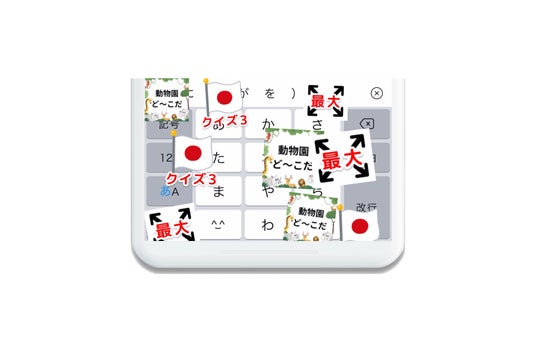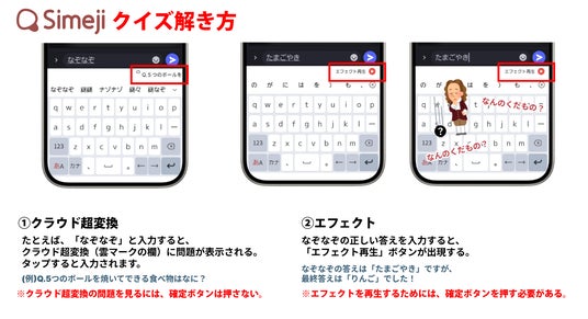 ユーザーが文字を入力し、変換候補より特定のキーワードを選択することで画像や動画がキーボード上に現れる機能です。当キャンペーンではクイズ内容をエフェクトとして表示します!クイズの回答を入力して、今回のキャンペーンならではのエフェクトをお楽しみください。