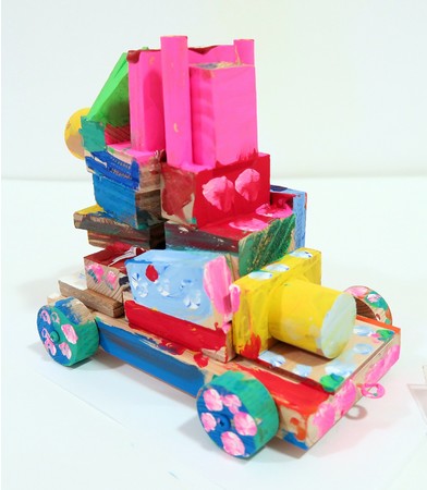 車輪のついた板(デコ車)にいろいろな形の木っ端をくっつけて、カッコイイ車をつくってみよう。