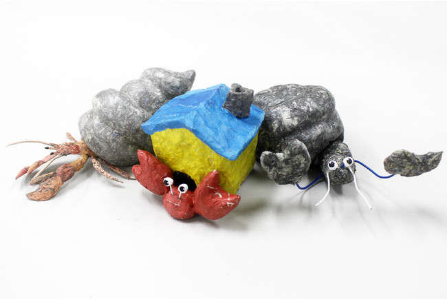 新聞紙でつくった粘土から、手のひらにのるくらいの大きさのやどかりを制作します。どのようにやどかりの特徴を表すかは自由です。初回は新聞紙を粘土にして、おおまかな形をつくります。乾燥した状態になった2回目は、複数の仕上げの工程から好きな方法を選び、作品を完成させます。夏の思い出に、オリジナルの「やどかり」をつくってみませんか。