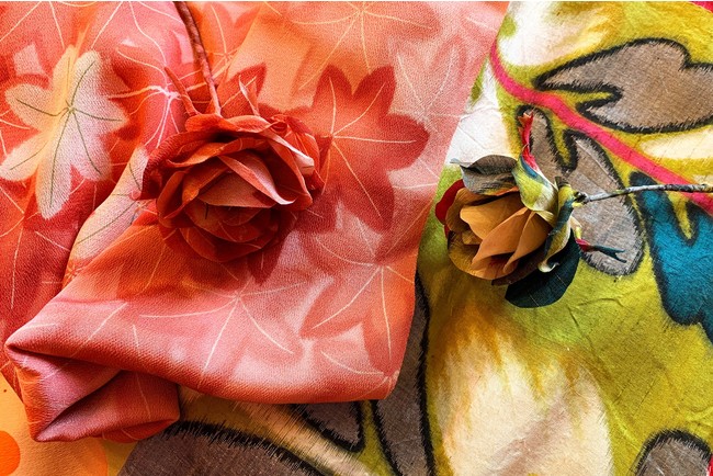 好きな着物地を選び、花びらの形を切り出し、コテで熱を加えながら立体的なバラの花をつくります。完成した花はそのまま飾ることも、コサージュにすることもできます。講師の伊東純子さんは、2016年から古い着物をほどいて一点物の洋服を制作しています。洋服をつくった後の余り生地も無駄にせず、生活を彩る美しい花に再生することができます。