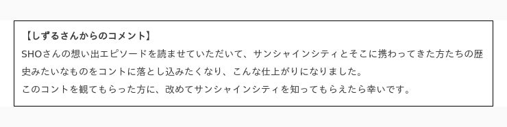 サンシャインシティで働くオフィスワーカーをはじめ、昨年7月~8月に公式ウェブサイトやSNSにて想い出エピソードを募り、72作品のエピソードが集まりました。ご応募いただいた様々な想い出から、入賞エピソードとして10作品を選定し、その中から4つの大賞エピソードが選出されました。