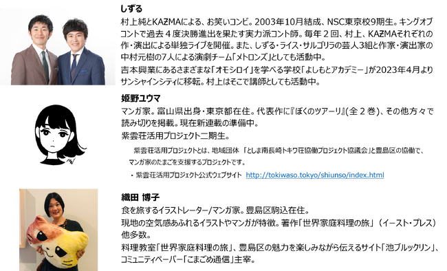 大賞エピソードは、豊島区やサンシャインシティに所縁のあるクリエイターが作品化。お笑いコンビのしずるさん、マンガ家の姫野ユウマさん、イラストレーター・マンガ家の織田博子さんとともに、コント映像やマンガ、イラスト作品を制作しました。