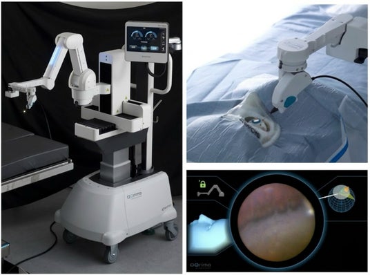 (左)OQrimoの外観。(右上)OQrimoに保持された眼内内視鏡を模型眼に挿入した様子。(右下)OQrimoに保持された内視鏡による周辺部網膜の実際の観察画像。