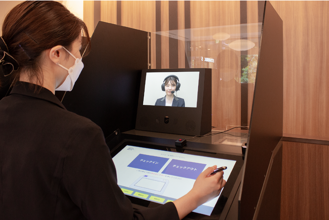 セルフチェックイン機を活用したリモート接遇サービスを導入します。お客さまご自身のペースでチェックイン&チェックアウトの手続きを行うことができ、操作やお困りごとがあれば遠隔地よりRemolineのスタッフがモニター越しにサポートします。
