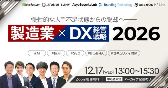 BEENOS株式会社の連結子会社で、特定技能雇用を包括支援するBEENOS HR Link株式会社(以下「BEENOS HR Link」)は、2025年12月17日(水)に開催される無料Webセミナー「\慢性的な人手不足状態からの脱却へ/ 製造業×DX経営戦略 2026」に、代表取締役社長の岡崎 陽介が登壇することをお知らせします。