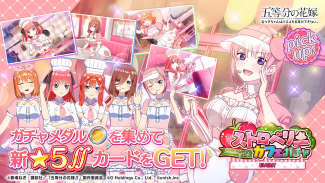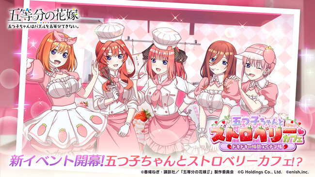 株式会社enish(本社:東京都港区、代表取締役社長:安徳 孝平、以下enish)は、2024年5月17日(金)より、アニメ「五等分の花嫁」初となるゲームアプリ『五等分の花嫁 五つ子ちゃんはパズルを五等分できない。』にて、週刊少年マガジン編集部完全監修のゲームオリジナルストーリーをお楽しみいただける新イベント「五つ子ちゃんとストロベリーカフェ~ドキドキの時間はイチゴ味~」を開催いたします。