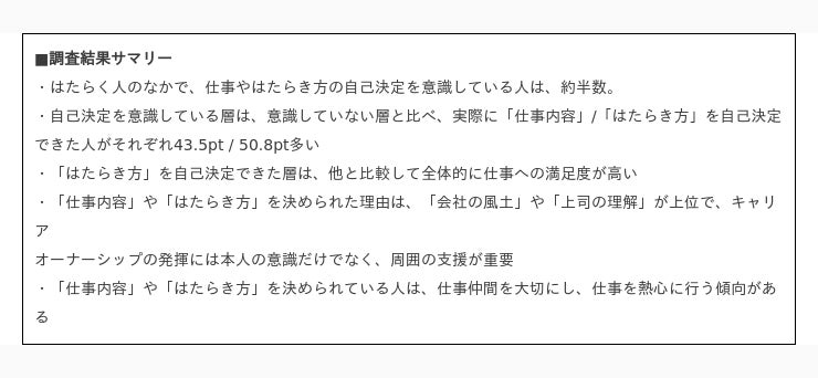 その結果見えてきたのが、自分で決める(自己決定する)意識を持つ人は、実際に仕事内容やはたらき方を