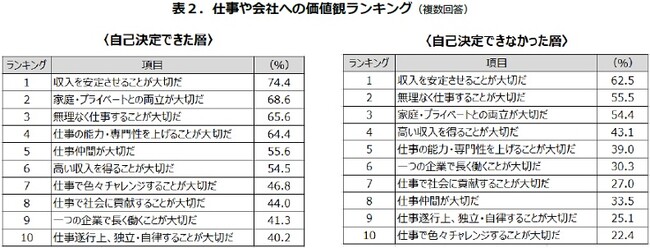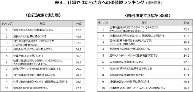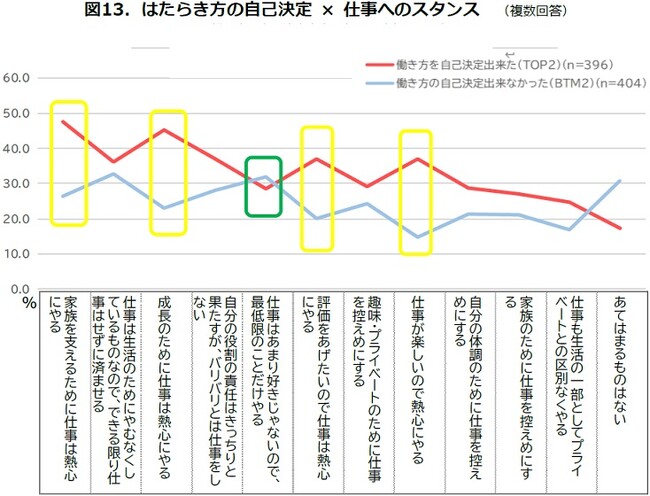 仕事へのスタンスについての質問では、「はたらき方」について「自己決定できた層」と「自己決定できなかった層」では、4つの項目で大きな差が出た。差が大きい順に、「成長のために仕事は熱心にやる(22.4pt差)」、「仕事が楽しいので熱心にやる(22.1pt差)」、「家族を支えるために仕事は熱心にやる(21.2pt差))」。「はたらき方」を「自己決定できた層」は、仕事を楽しみながら熱心にやる傾向がうかがえた。
