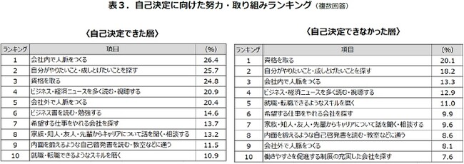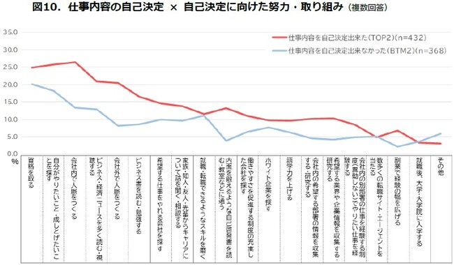 ◆仕事内容を自己決定できた層は、自分がやりたいことを探し、それを実現するために人脈づくりや自己啓発に取り組んでいることが伺える