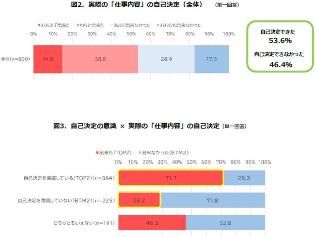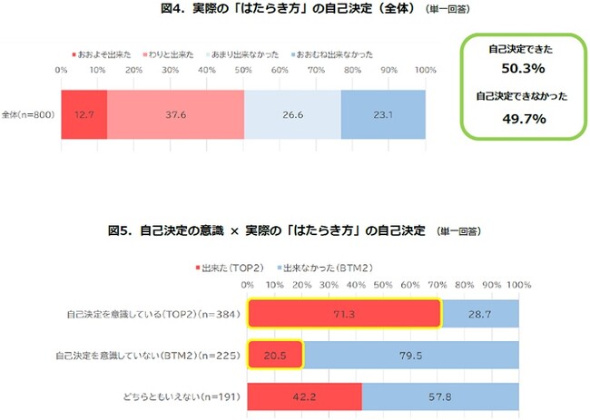 「仕事内容」と同様に「はたらき方」について、自分の意志で決めることができたかという質問では、全体では50.3%が自己決定(おおよそ出来た」と「わり出来た」)できたと回答。