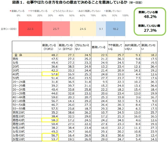 「自分の仕事やはたらき方を自らの意志で決めることを意識していますか」と尋ねると、およそ半数が意識している(「意識している」と「やや意識している」。以下、自己決定を意識している層)、30%弱が意識していない(「あまり意識していない」と「意識していない」。以下、自己決定を意識していない層)と回答。年齢別では40代から高くなり、50代になるとやや落ち着く傾向がみられた。年代×性別では、40代男性が最も高く58.3%、次いで40代女性の56.7%、50代女性の53.7%となった。