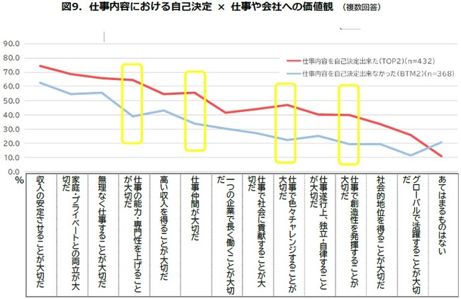 ◆仕事や会社への価値観は、仕事内容を自己決定できた層では、仕事仲間を大切にする意識が高い