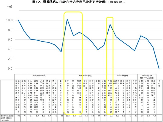 はたらき方を自己決定できた層に、自己決定できた理由を選んでもらったところ、1位に「テレワークしても良しとする風土」、5位に「時短勤務・育児休業は取って当然という風土」、6位に「早く退勤してもよい風土」と勤務先内の風土が10位以内に3つ入った。また3位には、「周囲の目をあまり気にしない割り切り・価値観」と強い意志がなければ、はたらき方を選択しにくいことがうかがえる結果がみられた。