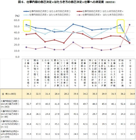 ◆「はたらき方」を自己決定できた層は、他と比較して全体的に仕事への満足度が高い