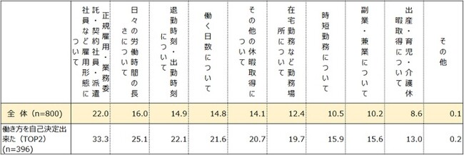 はたらき方を自己決定出来た場面について尋ねたところ、仕事内容を自己決定できた層では「雇用形態」や「日々の労働時間の長さ」、「退勤・出勤時間」などが上位に挙がっている。それらと比較すると、「出産・育児・介護休暇の取得」においては、自己決定できた場面として挙げる人の割合は少ない結果となった。