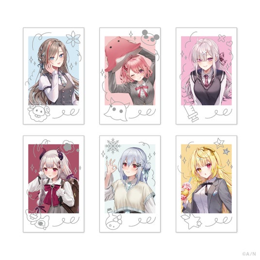グッズラインナップは、アクリルスタンド、ランダムチェキ風カード、糸とじノート&ペンセット、ダイカット付箋、スクールバッグ風ポーチの5種類。