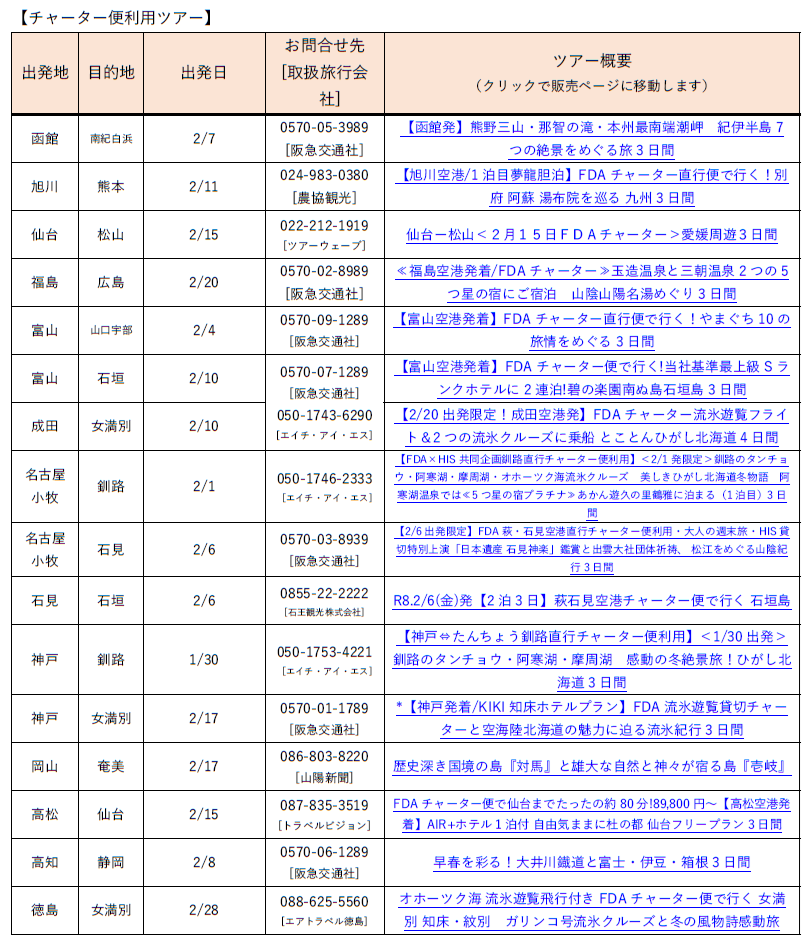 現在募集中の、FDAチャーター便を利用した旅行ツアーのご案内です。