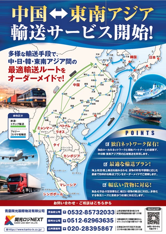 関光ロジNEXT(株)(代表取締役社長 入谷一成/以下「関光ロジNEXT」)は、この度、中国と東南アジアを結ぶ新たな輸送サービスを開始いたしました 。多様な輸送手段を駆使し、中国、日本、韓国、そして東南アジア間の最適な輸送ルートをお客様のニーズに合わせてオーダーメイドで提供いたします。