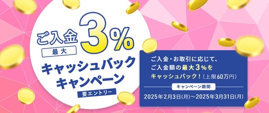 トレイダーズホールディングス株式会社(東京証券取引所スタンダード市場8704)のグループ会社で、外国為替証拠金取引事業(FX取引)等を営むトレイダーズ証券株式会社(本社:東京都渋谷区、代表取締役:須山 剛、以下「トレイダーズ証券」)は、2025年2月3日(月)より外国為替取引サービス「みんなのFX」及び「LIGHT FX」において、「ご入金で最大3%キャッシュバックキャンペーン」を実施することを決定しました。
