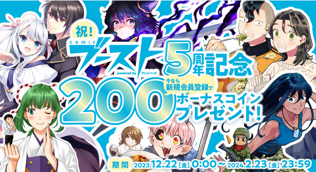 株式会社幻冬舎コミックス(本社:東京都渋谷区、代表取締役社長:石原正康)の、webマンガサイト『comicブースト』(https://comic-boost.com/)は、2024年1月にサイト開設5周年を迎えます。それに先んじ、本日12月22日(金)~2月23日(金)まで5周年記念企画がスタートします。