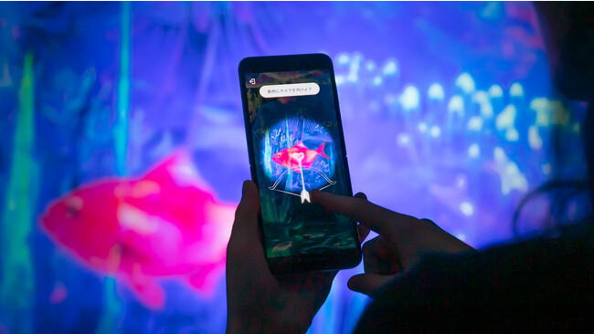 アプリのカメラで空間を泳ぐ魚を見て、そのカメラに写っている魚に「観察の矢」を放つと、現実の空間に「観察の矢」が飛んでいきます。「観察の矢」が当たると、空間からその魚は消え、スマートフォンに入ります。観察した魚の情報は、アプリの図鑑にコレクションされます。捕まえた魚を、アプリのカメラで見えている場所にスワイプすると、リリースされ、その場所に戻ります。