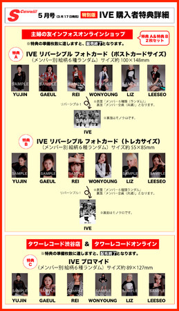 さらに、「主婦の友インフォスオンラインショップ」「タワーレコードオンライン」「タワーレコード渋谷」でIVEが表紙の『S Cawaii! 5月号【特別版】』を購入していただいた方に、購入者特典を差し上げます!