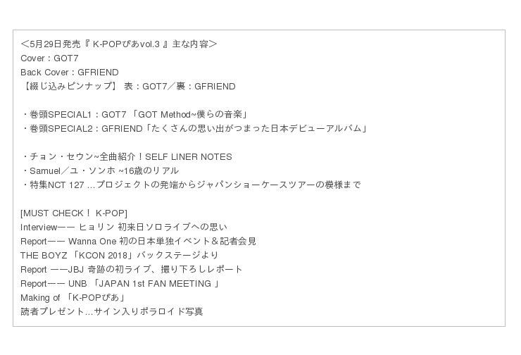 5月29日発売、K-POPカルチャーをキャッチする、グラビア&インタビューMAGAZINE『K-POPぴあ』の第3弾、表紙・巻頭SpecialはGOT7! 撮りおろしグラビア&インタビューで20ページの特集です。 6月20日にリリースされる『THE New Era』の製作過程のほか、ライブで盛り上がる曲は? ルーツミュージックは?などなど、GOT7の音楽に迫ります。