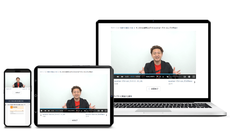インターネット環境があれば、いつでも、どこでも、パソコン・タブレット・スマートフォン等で、マイページから講義を受講することができます。画面にはテキストが同時表示されるので、テキストを持ち歩く必要がありません。